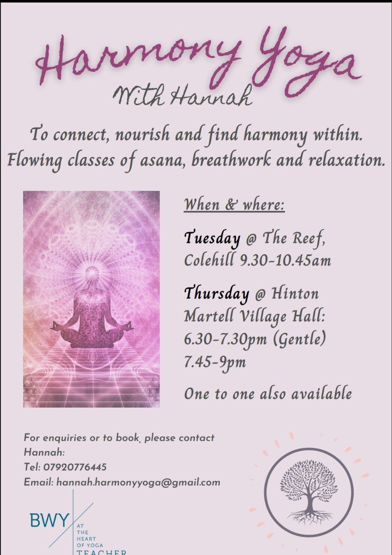 Hannah from Harmony Yoga is teaching two Yoga classes every Thursday evening at the Village Hall. There is a gentle session (ideal for beginners) starting at 6.30pm and a more advanced class at 7.45pm. If you would like to come along, please contact Hannah directly (see the poster below). The first session is free, so you can try it out without obligation.